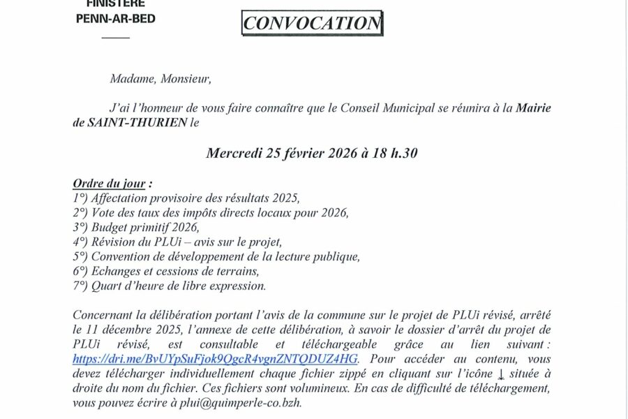 Prochain conseil municipal : 25 février 2026 ActualitésMairie Prochain conseil municipal : 25 février 2026 Mairie de Saint-Thurien18 février 2026